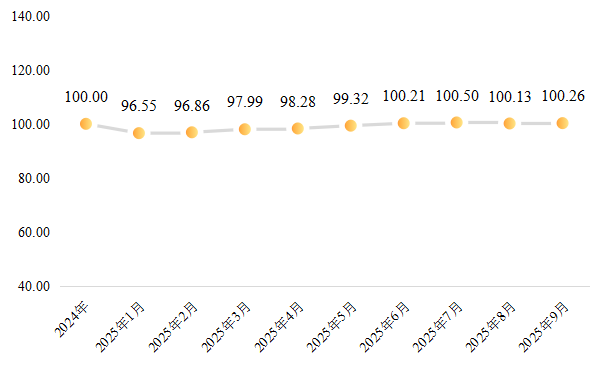 2025年三季度,通辽黄玉米产品价格指数由7月100.50点波动运行至9月100.26点,较6月上涨0.05个百分点;本季度指数窄幅波动,表明通辽黄玉米市场供需关系总体均衡,价格运行态势平稳。
