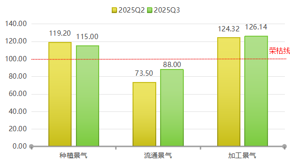 流通景气指数回升14.50个百分点至88.00点,虽仍处于荣枯线以下,但较上季度显著收窄差距。表明本季度黄玉米产业流通环节虽仍未及荣枯线,但相较于上季度已释放出修复信号。