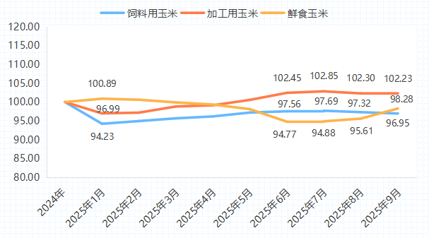 产品价格指数根据用途不同又分为饲料用玉米、加工用玉米和鲜食玉米三大类。2025年三季度,三类玉米产品价格指数运行走势出现分化,具体运行情况见下图: