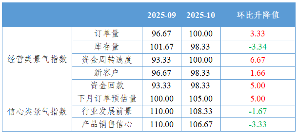 10月衡水工程橡胶企业信心类景气指数表现良好。下月订单预估量、行业发展前景和产品销售信心景气指数本期分别收于105.00点、108.33点和106.67点,均位于景气区间运行。