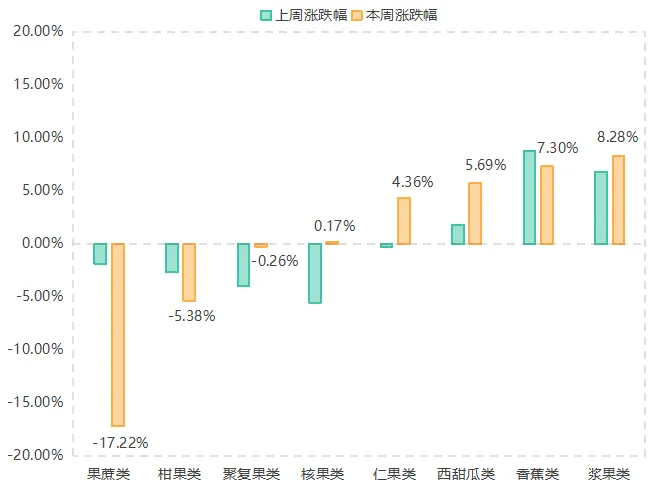 价格指数下降品类中:果蔗类(-17.22%)、柑果类(-5.38%)水果价格指数本期降幅均有所扩大;聚复果类水果价格指数本期降幅收窄至0.26%。