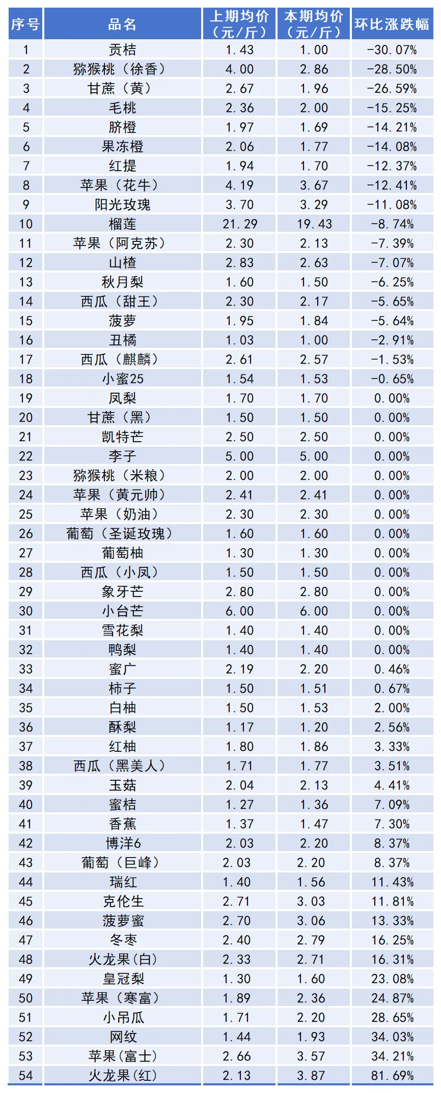 从具体水果品种来看,本期价格上涨的水果有22种,占总水果品种的40.74%,其中火龙果本期均价3.87元/斤,上期均价2.13元/斤,环比涨幅达81.69%;价格下跌的水果有18种,占总水果品种的33.33%,其中贡桔本期均价1.00元/斤,上期均价1.43元/斤,环比下降30.07%;本期价格持平的水果有14种。