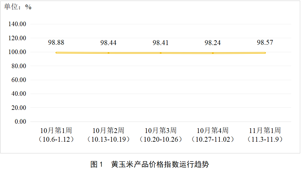 如上图所示,2025年11月第1周,通辽黄玉米产品价格指数为98.57点,环比微涨0.33个百分点。