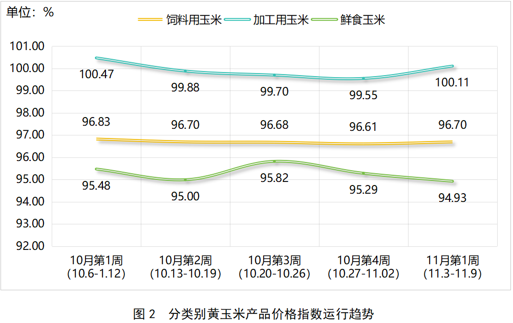 如上图所示,本期饲料用玉米、加工用玉米分别为96.70点、100.11点,环比分别上涨0.09个百分点、0.56个百分点;鲜食玉米为94.93点,环比下跌0.36个百分点。