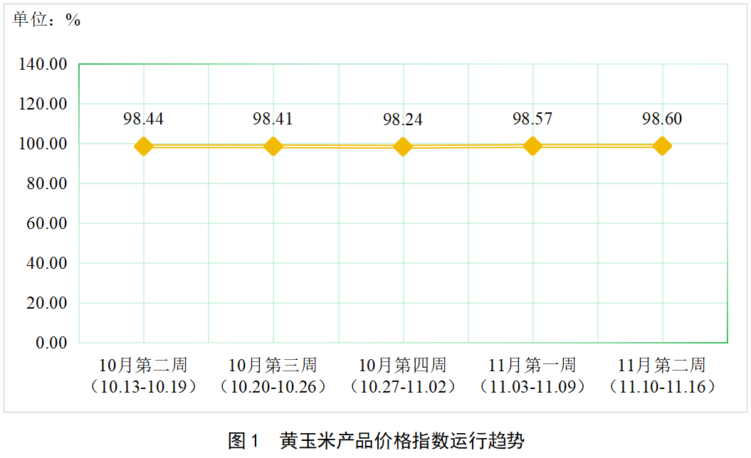 如上图所示,2025年11月第2周,通辽黄玉米产品价格指数为98.60点,环比微涨0.03个百分点。