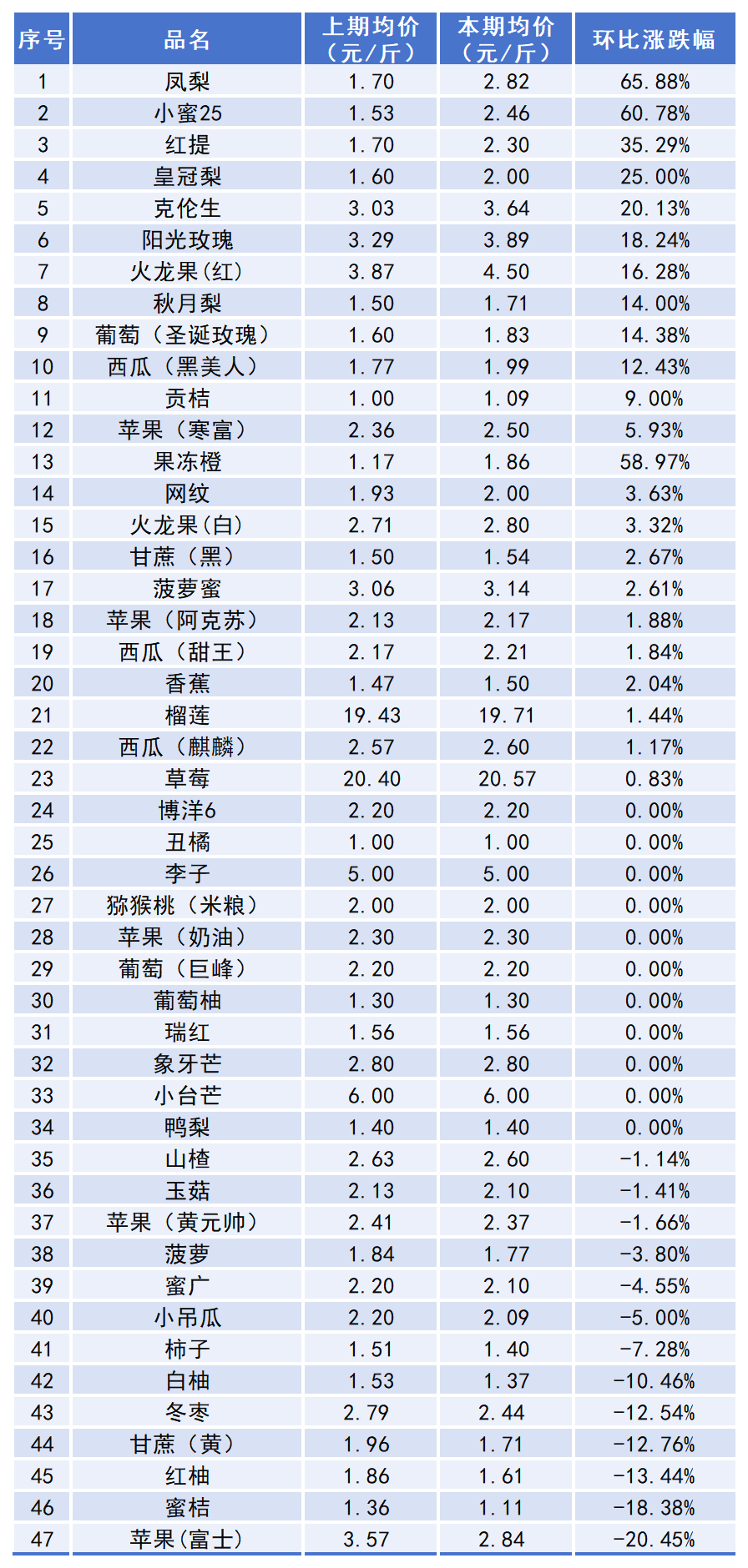 从具体水果品种来看,本期价格上涨的水果有23种,占总水果品种的48.94%,其中凤梨本期均价2.82元/斤,上期均价1.70元/斤,环比涨幅达65.88%;价格下跌的有13种,占总水果品种的27.66%,其中苹果(富士)本期均价2.84元/斤,上期均价3.57元/斤,环比下降20.45%;本期价格持平的水果有11种。