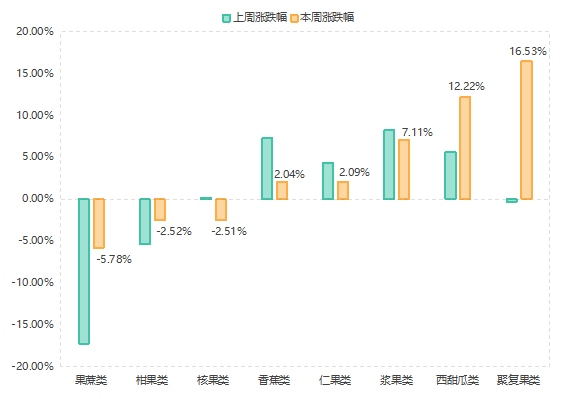 价格指数上升品类中:香蕉类(2.04%)、仁果类(2.09%)、浆果类(7.11%)水果价格指数本期升幅有所收窄;西甜瓜类水果价格指数本期升幅则扩大至12.22%;聚复果类(16.53%)水果价格指数本期止降为升。