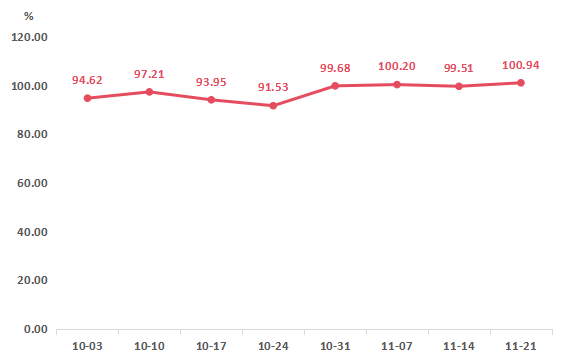 11月下旬,受元旦节前备货需求拉动、主产区供应阶段性偏紧以及农户惜售情绪等因素影响,部分水果品类价格延续上涨态势。在“本地+外地”双供应格局逐步完善背景下,整体均价正向平价区间温和靠拢。