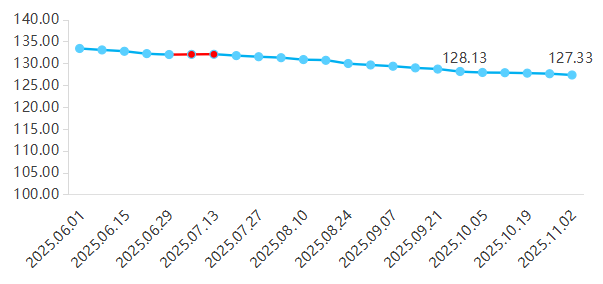 10月,安国中药材价格指数整体呈现缓步下行走势,但单周跌幅明显收窄。月初(09.29-10.05)指数为127.91点,环比9月末微跌0.17%,随后三周指数波动幅度均控制在0.1%以内,至月末(10.27-11.02)收于127.33点,全月累计下跌0.62%。指数走势表明,尽管处于传统消费旺季,但市场供需矛盾尚未根本缓解,指数缺乏强劲反弹动力。从周度走势看,10月各周指数波动区间在127.33-127.91点之间,振幅明显收窄,显示市场进入底部盘整阶段。