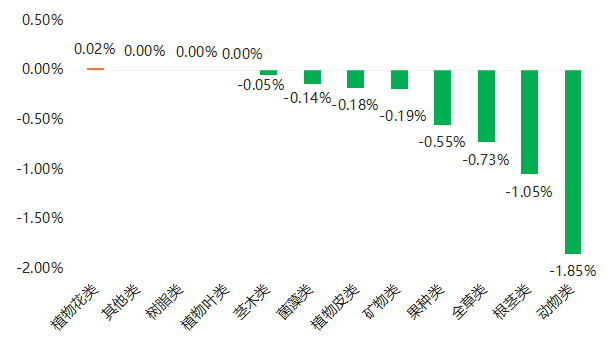 从细分品类看,12个子类中仅植物花类(+0.02%)实现微涨,其他类、树脂类、植物叶类三大子类价格持平,其余8个子类均呈现不同程度下跌。其中动物类(-1.85%)、根茎类(-1.05%)跌幅居前。具体表现如下: