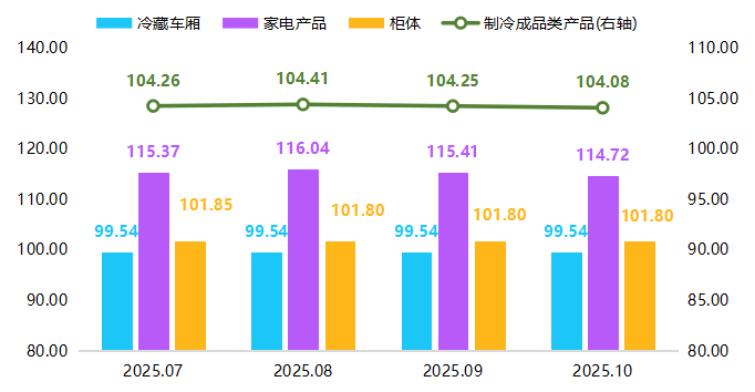 10月,受家电产品价格小幅下降影响,成品类制冷产品价格指数有所下行,指数收于104.08点,环比下降0.17个百分点。