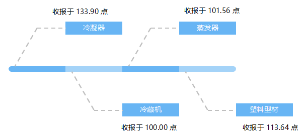 10月制冷配件类产品价格指数收于112.79点,环比持平。细分品类中,冷凝器、冷藏机、蒸发器和塑料型材价格指数分别保持在133.90点、100.00点、101.56点和113.64点稳定运行。