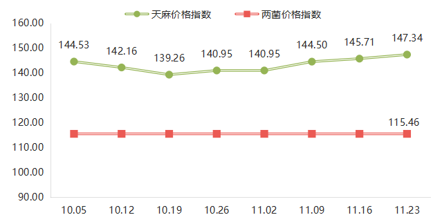 天麻价格指数延续涨势,11月第二周、第三周分别上涨至145.71点和147.34点,环比涨幅分别为0.84%和1.12%。两菌价格指数持续稳定在115.46点。