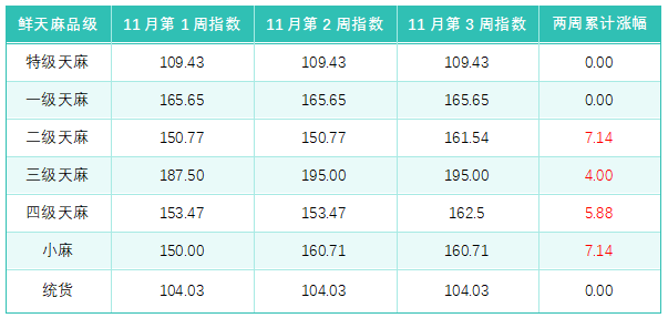 干天麻价格指数继续稳定在143.12点,加工企业和持货商仍在执行“稳价去库存”策略,市场对上一季干天麻的消化进程较为缓慢,加之新一季鲜天麻进入加工,市场走货更为迟缓,短期内尚未出现推动价格上涨的核心动力。与此形成鲜明对比的是鲜天麻价格指数的持续活跃表现,从11月第一周的145.63点上涨至第三周的150.79点,两周累计涨幅3.54%,反映终端消费市场需求持续回暖,鲜天麻成为带动市场活跃的主要力量。