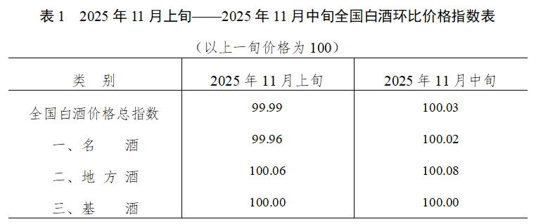 泸州·中国白酒商品批发价格指数办公室发布的数据显示,2025年11月中旬全国白酒环比价格总指数为100.03,上涨0.03%。从分类指数看,名酒环比价格指数为100.02,上涨0.02%;地方酒环比价格指数为100.08,上涨0.08%。基酒环比价格指数为100.00,保持稳定。(见表1)