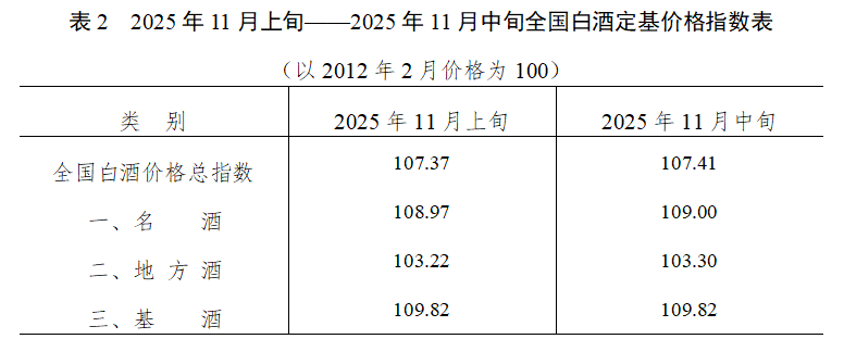 从定基价格指数看,2025年11月中旬全国白酒商品批发价格定基总指数为107.41,上涨7.41%。其中,名酒定基价格指数为109.00,上涨9.00%;地方酒定基价格指数为103.30,上涨3.30%;基酒定基价格指数为109.82,上涨9.82%。(见表2)