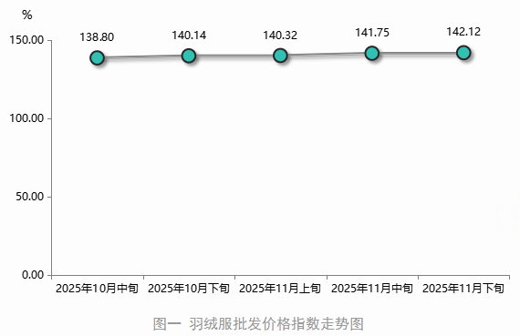 受原材料成本上涨与市场需求增加共同影响,羽绒服市场价格普遍上涨。2025年11月下旬,羽绒服批发价格指数收报于142.12点,环比上涨0.26%,延续了前期上涨趋势,但涨幅有所收窄,显示出市场价格在持续攀升后在相对高位趋于稳定。具体走势如下: