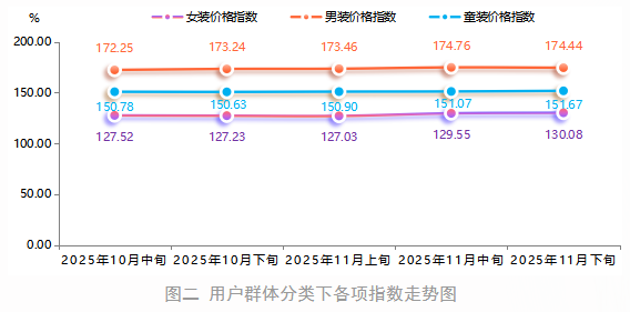11月下旬,不同用户群体消费市场整体以温和上涨为主。女装价格指数收报于130.08点,环比上涨0.41%,延续回暖态势,女性消费市场持续复苏。童装价格指数为151.67点,环比微涨0.40%,走势相对平稳,童装品类供需结构基本平衡,在整体市场升温背景下维持稳中有升的运行态势。男装价格指数收报于174.44点,环比下跌0.18%,市场对新款高价男装的接受度有限,导致价格上涨动力不足。具体运行情况如下: