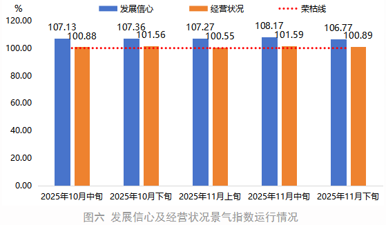 细分指标中,发展信心指数为106.77点,与羽绒服市场景气指数走势一致,显示商户对行业中长期前景保持乐观;经营状况指数为100.89点,略高于荣枯线,反映旺季背景下,市场在供需动态平衡中展现出韧性。商户积极优化产品结构,提升设计附加值,以应对成本压力与多样化需求,经营状况基本稳定。