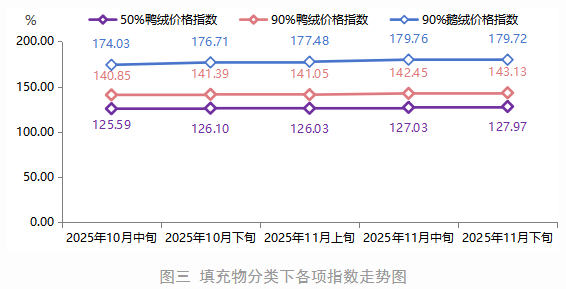 11月下旬,不同填充物分类的羽绒服市场需求分化格局依旧显著。90%鹅绒价格指数收报于179.72点,环比下跌0.02%,在经历前期快速上涨后,高端鹅绒市场步入价格平台期,下游备货需求放缓,市场呈观望态势。90%鸭绒价格指数收报于143.13点,环比上涨0.47%,维持稳健上行,行业销售旺季,上游持货商对低价出售普遍抱有抗拒情绪,使得对应产品价格在高位获得支撑。50%鸭绒价格指数为127.97点,环比上涨0.74%,部分追求性价比的消费者转向中低端市场,推动其价格回暖。具体走势如下: