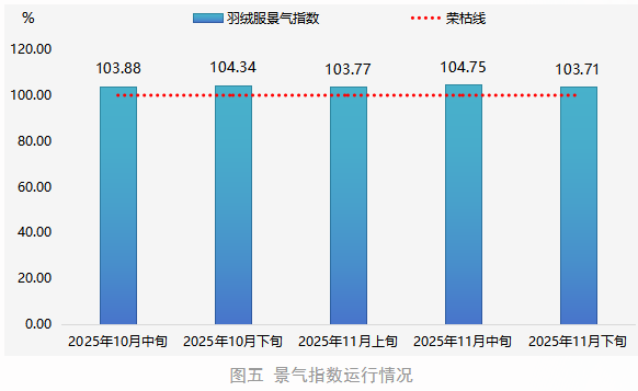 本期,羽绒服市场景气指数为103.71点,虽较上期略有回落,增速有所放缓,但仍高于荣枯线,市场整体仍保持扩张态势。