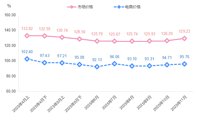 电商价格指数延续涨势。11月,电商价格指数收于95.76点,环比上涨1.11%。细分品类中,西瓜菠萝成为电商市场最大亮点,价格指数环比上涨4.78%,收于78.21点,其口感清甜、适合榨汁等产品特性,在“双十一”健康饮品原料促销中销量增加。巴厘菠萝和小菠萝作为大众消费主力品种,电商平台通过“秒杀”“拼团”等策略,在价格小幅上涨的同时实现销量同比增长。