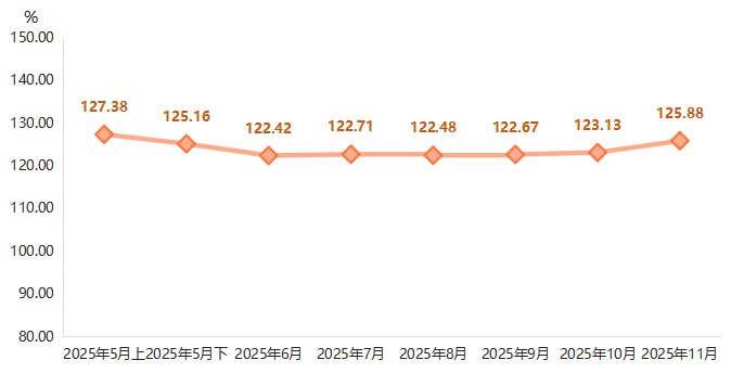 据“徐闻·中国菠萝指数”监测,2025年11月,徐闻菠萝产品价格指数环比显著回升,指数收于125.88点,环比上涨2.23%,同比上涨1.38%。指数走势如下图所示: