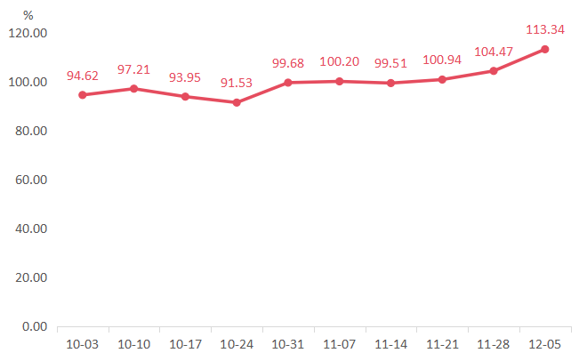 据“南大堡市场蔬果指数”信息系统监测,本期水果(周定基)价格指数升幅持续扩大,收于113.34点,环比上升8.49%。