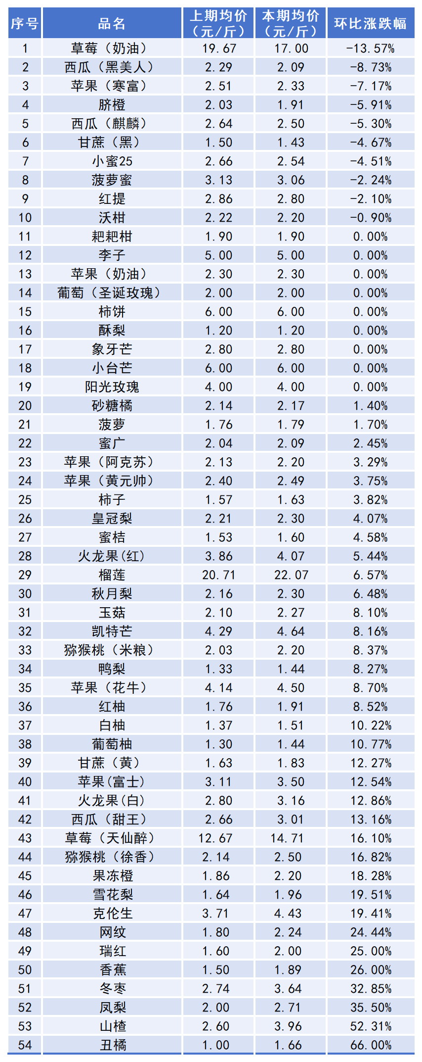 从具体水果品种来看,本期价格上涨的水果有35种,占总水果品种的64.81%,其中丑橘本期均价1.66元/斤,上期均价1.00元/斤,环比涨幅达66.00%;价格下跌的水果有10种,占总水果品种的18.52%,其中草莓(奶油)本期均价17.00元/斤,上期均价19.67元/斤,环比下降13.57%;本期价格持平的水果有9种。