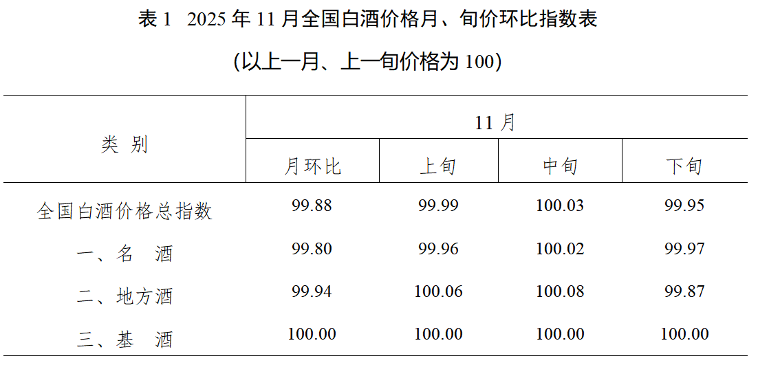 泸州·中国白酒商品批发价格指数办公室发布的数据显示,11月全国白酒环比价格总指数为99.88,下跌0.12%。其中,名酒环比价格指数为99.80,下跌0.20%;地方酒环比价格指数为99.94,下跌0.06%;基酒环比价格指数为100.00,保持稳定。(见表1)