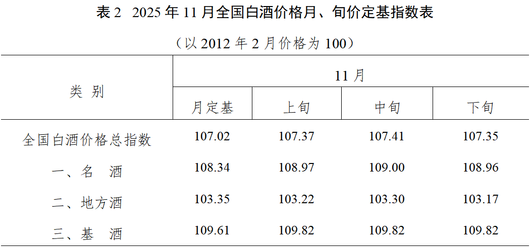 从月定基价格指数看,11月全国白酒定基价格总指数为107.02,上涨7.02%。其中,名酒定基价格指数为108.34,上涨8.34%;地方酒定基价格指数为103.35,上涨3.35%;基酒定基价格指数为109.61,上涨9.61%。(见表2)