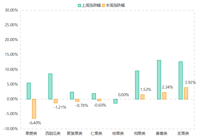 具体品类来看,本期八大类水果价格指数中,果蔗类(-6.40%)、西甜瓜类(-1.21%)、聚复果类(-0.78%)、仁果类(-0.60%)水果价格指数本期均由升转降;柑果类、香蕉类、浆果类水果价格价格本期升幅则分别收窄至1.52%、2.34%、3.92%;核果类水果价格指数本期环比持平。