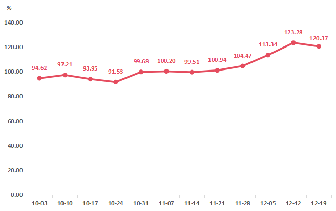 据“南大堡市场蔬果指数”信息系统监测,本期水果(周定基)价格指数小幅回落至120.37点,环比下降2.36%。