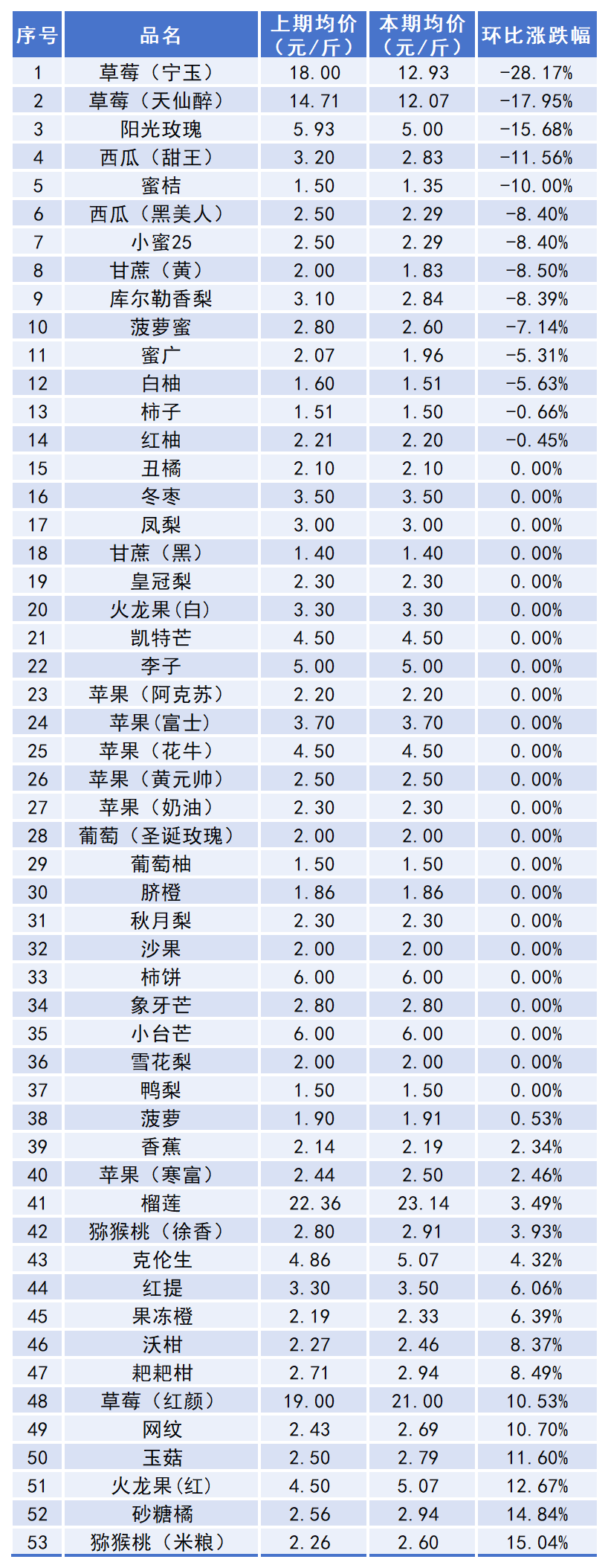 从具体水果品种来看,本期价格上涨的水果有16种,占总水果品种的30.19%,其中猕猴桃(米粮)本期均价2.60元/斤,上期均价2.26元/斤,环比涨幅达15.04%;价格下跌的水果有14种,占总水果品种的26.42%,其中草莓(宁玉)本期均价12.93元/斤,上期均价18.00元/斤,环比下降28.17%;本期价格持平的水果有23种。