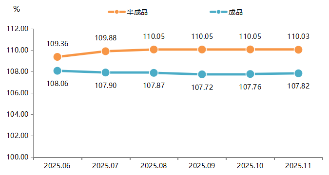 11月,半成品价格指数为110.03点,环比下降0.02%,同比上涨0.70%,表明上游原料成本支撑依然稳固,企业生产备货行为趋于理性。
