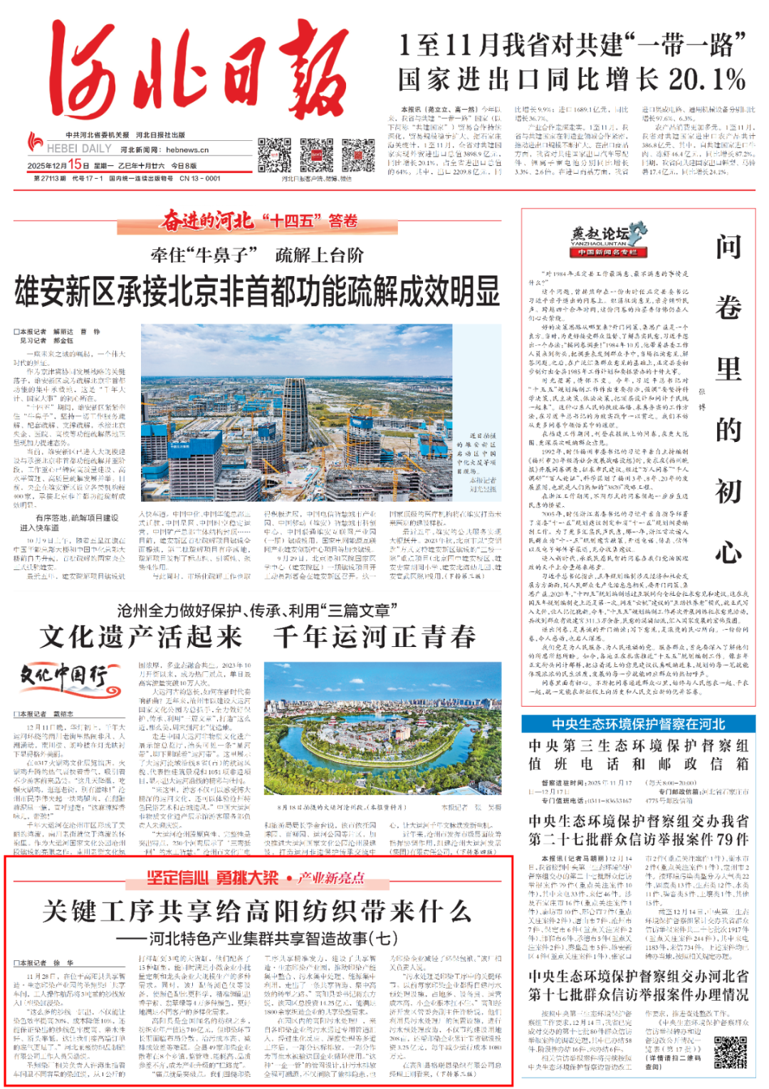 2025年12月15日,《河北日报》刊发报道《关键工序共享给高阳纺织带来什么——河北特色产业集群共享智造故事(七)》。