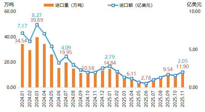 随着中美双方下调关税政策推进落实,11月棉花进口量在年内首度实现同比增长,下游纺织企业选择使用相对更便宜的进口棉花降低生产成本。据海关总署最新公布数据,2025年1-11月份中国累计进口棉花89.28万吨,累计进口量同比减少64.03%。其中,11月中国棉花进口量为11.90万吨,环比同比均有不同程度增加。