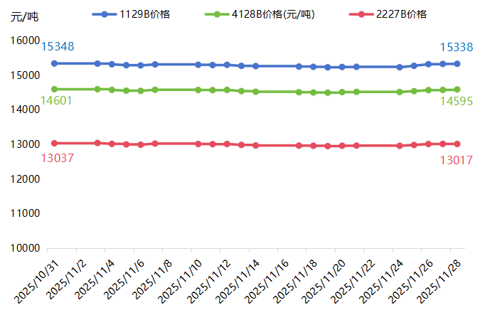 国内来看,受季节性供应压力释放及下游补库节奏放缓影响,棉花价格有所回落。截至11月28日,中国棉花协会公布的1129B、2227B、4128B价格分别为15338、13017、14595元/吨,较10月31日分别下降0.07%、0.15%和0.04%。值得注意的是,本轮下降,跌幅有限,市场整体保持窄幅波动运行格局。