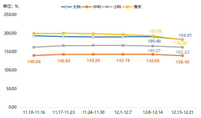 细分产品中价格指数均有不同程度下跌。具体来看,大料、焦末价格指数降幅较大,本期指数分别为183.01点、182.42点,环比分别下降4.02%、5.41%;中料、小料价格指数降幅相对较小,分别为2.43%、1.90%。