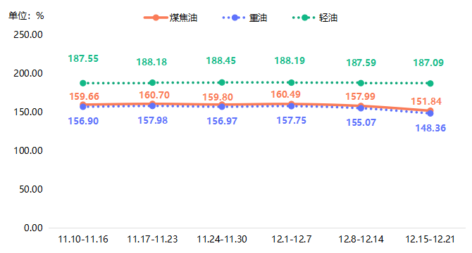 本期,煤焦油价格指数收报于151.84点,环比下降3.89%。分析来看,国际油价持续低位震荡,叠加国内成品油市场表现低迷,导致下游加氢产品价格同步回落,对煤焦油成本支撑不足。在此背景下,下游企业压价心态增强,采购力度减弱,同时临近年底,焦化企业在资金与出货双重压力下,议价能力受限。整体市场看空情绪逐渐蔓延,交投氛围低迷,预计短期内煤焦油价格仍将承压下行。细分来看,重油、轻油价格指数继续下降,环比降幅分别为4.33%、0.27%。