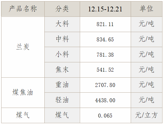 兰炭及其附属产品平均价格(2025.12.15-12.21)