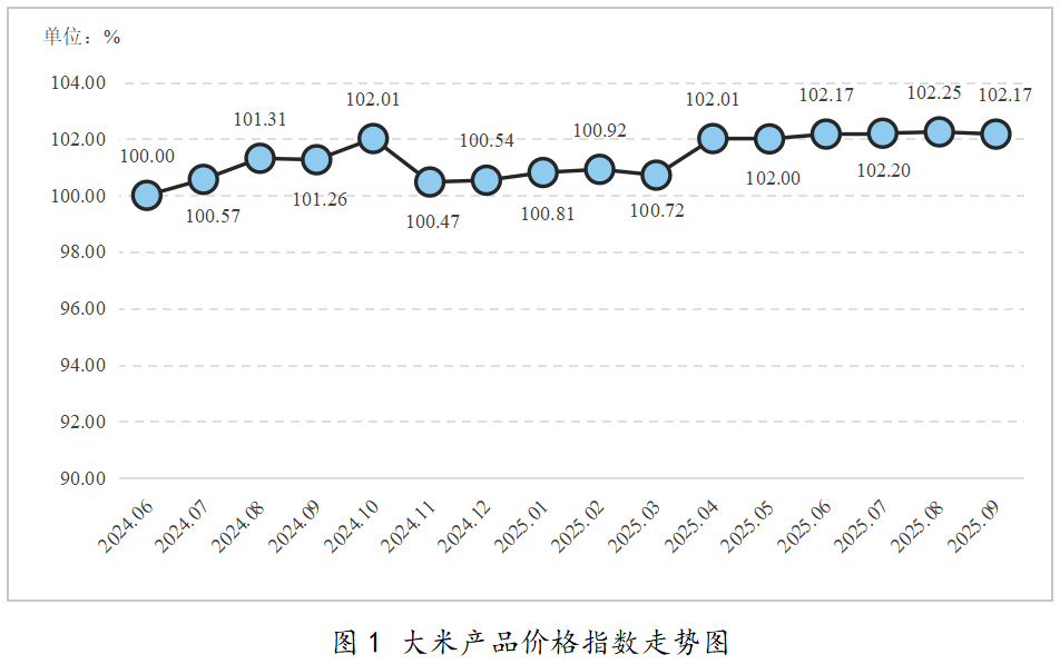 2025年9月,大米产品价格指数小幅下降,指数值为102.17点,较上月下降0.08个百分点。具体运行情况如下图所示: