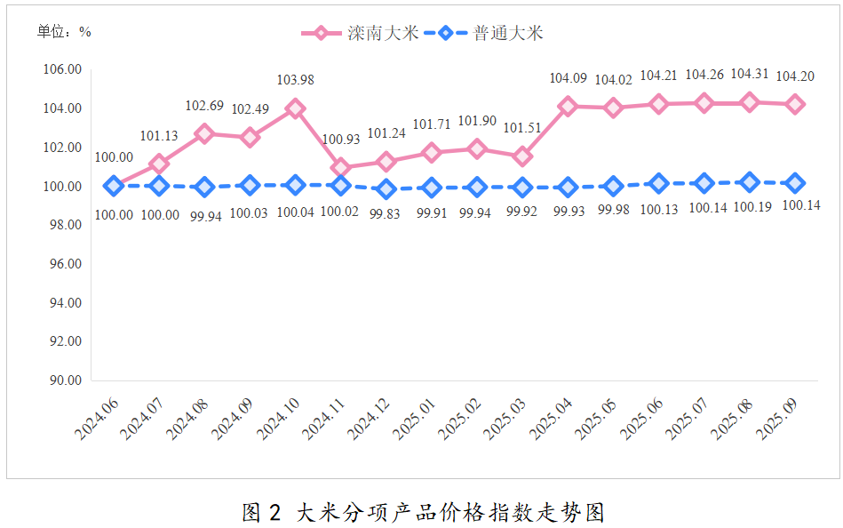 分项产品价格指数方面,滦南大米与普通大米价格指数略有下降。2025年9月,滦南大米价格指数为104.31点。其中,散装滦南大米价格指数较上月上升0.21个百分点至105.02点;包装滦南大米价格指数保持平稳,指数值为103.38点。普通大米价格指数值为100.14点,其中籼米价格小幅回落,指数值为99.80点,较上月下降0.15个百分点;粳米价格小幅上涨,指数较上月增长0.18个百分点至100.93点。分项指数具体走势见下图: