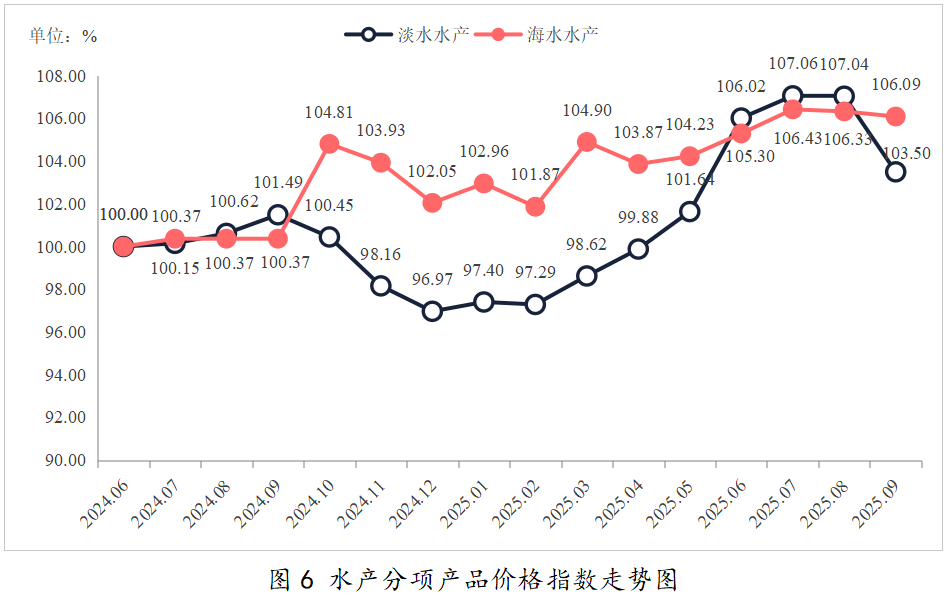 分项产品价格指数方面,9月淡水水产与海水水产价格指数均有不同程度下降。其中,淡水水产价格指数为103.50点,较上月下降3.54个百分点;海水水产价格指数为106.09点,较上月下降0.24个百分点。分项指数具体走势见下图: