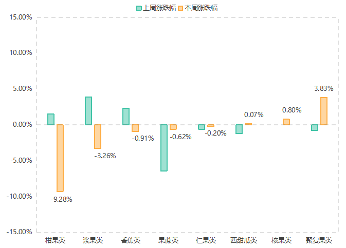 具体品类来看,本期八大类水果价格指数中,柑果类(-9.28%)、浆果类(-3.26%)、香蕉类(-0.91%)水果价格指数本期均由涨转跌;果蔗类和仁果类水果价格指数跌幅均有所收窄;核果类水果价格指数由上期的持平转为小幅上涨,涨幅为0.80%;聚复果类和西甜瓜类水果价格指数走势积极,均由跌转涨,涨幅分别为3.83%和0.07%。