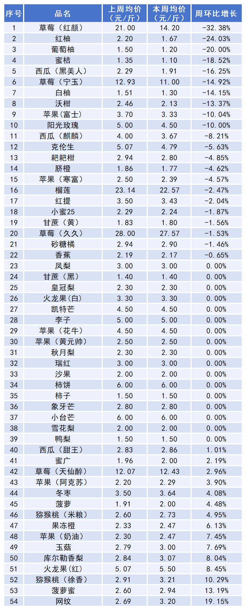 从具体水果品种来看,本期价格上涨的水果有15种,占总水果品种的27.78%;价格下跌的水果有22种,占总水果品种的40.74%;本期价格持平的水果有17种。