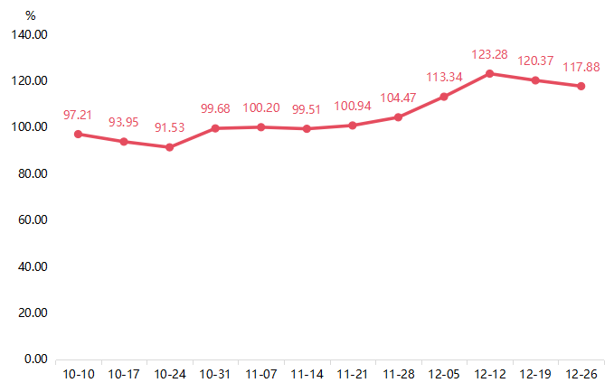 据“南大堡市场蔬果指数”信息系统监测,本期水果(周定基)价格指数继续下行,收于117.88点,环比跌幅2.07%。