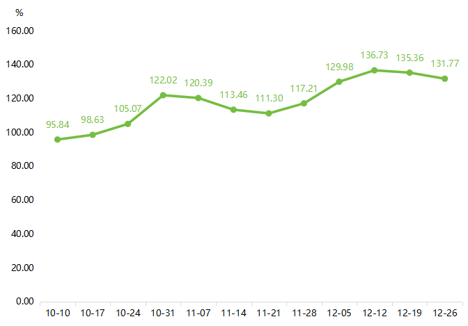 据“南大堡市场蔬果指数”信息系统监测,本期蔬菜(周定基)价格指数继续回调,收于131.77点,环比下降2.65%。