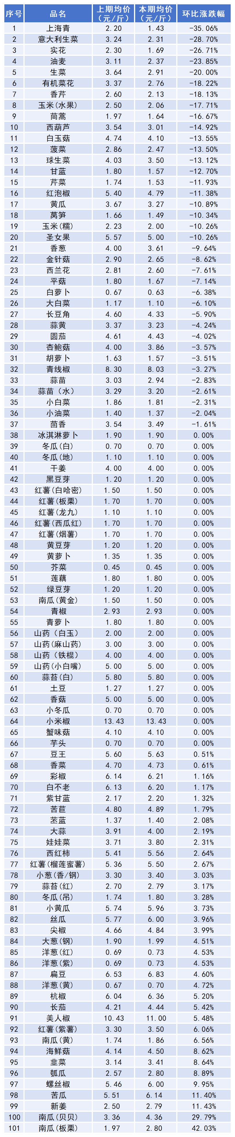 四、本期蔬菜价格涨跌表