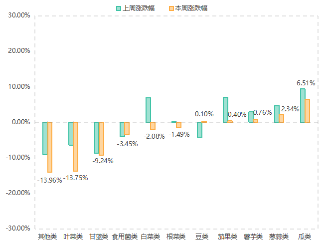 价格指数下降品类中:食用菌类(-3.45%)、甘蓝类(-9.24%)、叶菜类(-13.75%)和其他类(-13.96%)蔬菜价格指数均连续下行;白菜类和根菜类双双由涨转跌,跌幅分别为2.08%和1.49%。